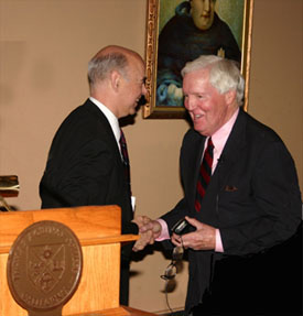 Late President Thomas E. Dillon and Ambassador Frank Shakespeare in 2006This coming Saturday, Commencement Day at Thomas Aquinas College, marks the 100th anniversary of Our Lady’s first apparition in Fatima, Portugal. Fittingly, members of the Class of 2017 have chosen Our Lady of Fatima as their patron saint.